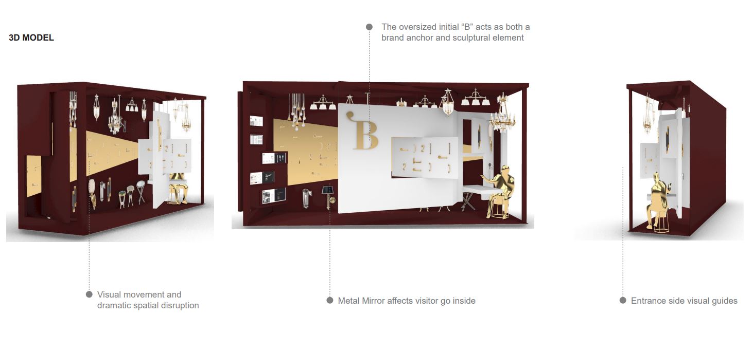 This stand, through a folding window, acts as a view to show the world a snap of the Bronzetto company. It is driven by the concept of folding geometry and visual impact, using suspended, angular forms that appear to float, rotate, and break through boundaries. The design creates a sense of movement and spatial disruption.